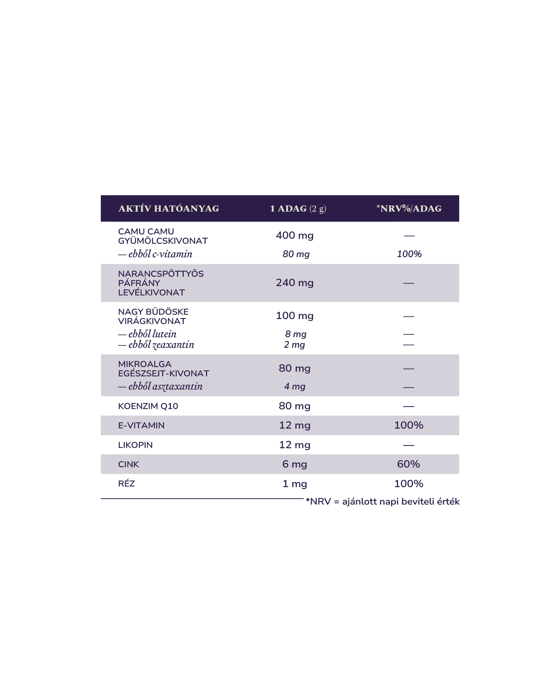 A formula válogatott növényi kivonatokat, karotinoidokat (likopin, asztaxantin, lutein, zeaxantin), vitaminokat és koenzim Q10-et tartalmaz.