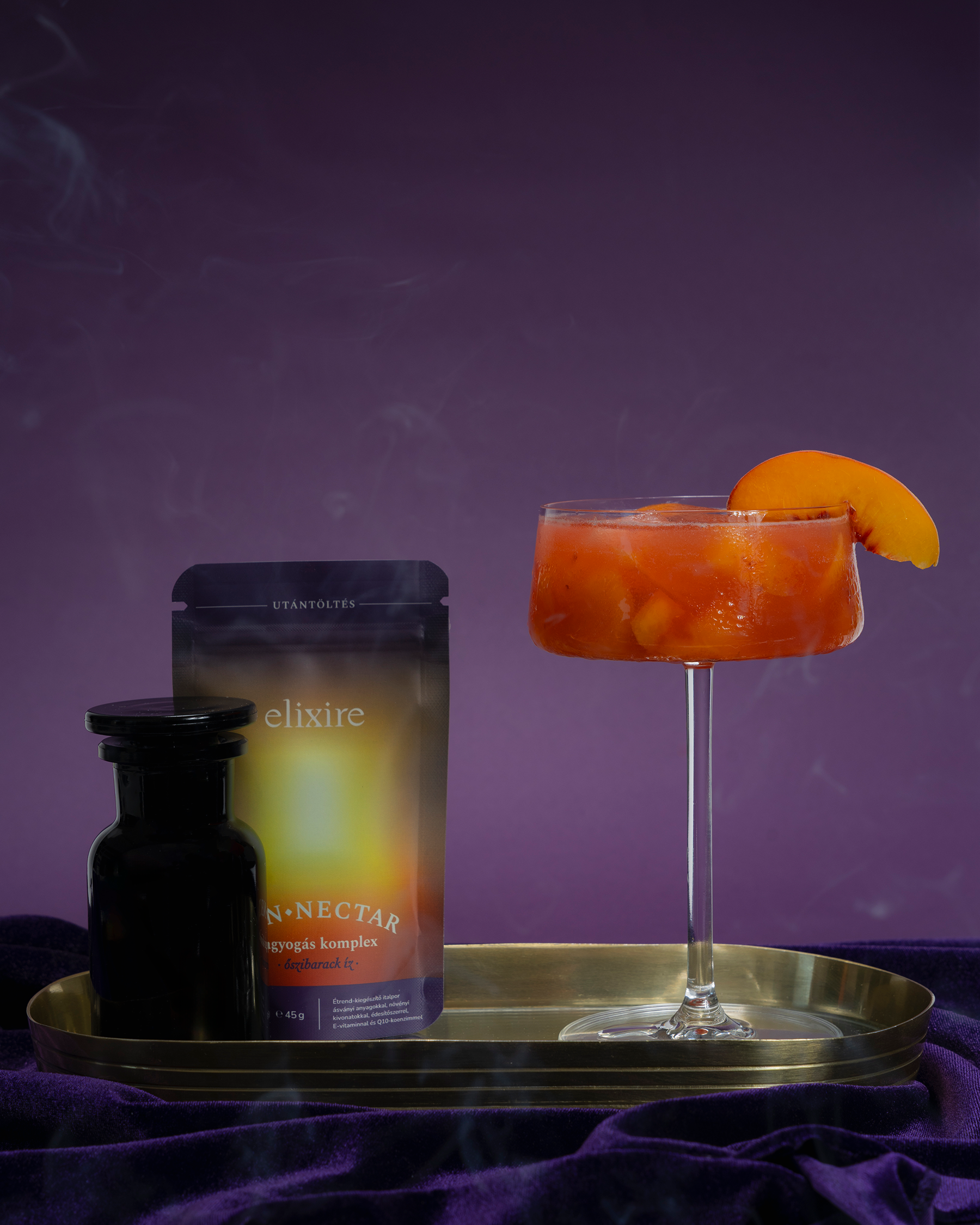 MCT (közepes láncú trigliceridek) kókuszolajpor, camu camu gyümölcskivonat (Myrciaria dubia), természetes őszibarackaroma, savanyúságot szabályozó anyag: almasav, narancspöttyös páfrány (Polypodium leucotomos) levélkivonat, likopin, nagy büdöske (Tagetes erecta) virágkivonat, mikroalga egészsejt-kivonat (Haematococcus pluvialis), koenzim Q10, édesítőszer: szteviol-glikozidok, E-vitamin (D-alfa-tokoferol), cink-biszglicinát, réz-glükonát.